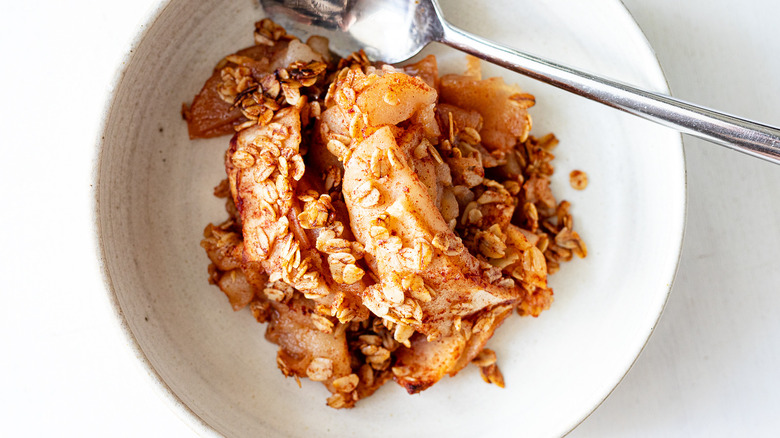 Next, peel the apples, and then slice them into quarter-inch slices. Castellano says, "Quarter-inch slices are the best width for apple crisp — anything more or less will result in limp, soggy apples or underdone apples." Once you have the apples prepped and sliced, toss them in a bowl with the coconut oil, maple syrup, spices, and salt, and combine well. "Do not forget the salt! It is a must to balance out the sugar," Castellano reminds us.