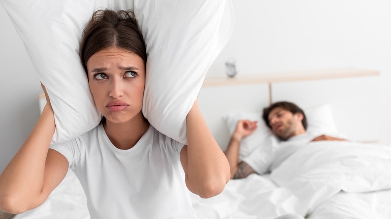 People with sleep apnea experience pauses in breathing as they're sleeping (via Johns Hopkins Medicine). This can occur throughout the night, for up to 20 or 30 seconds at a time. It happens when the airway at the back of the throat becomes obstructed or collapses, making it difficult for you to inhale and exhale normally.