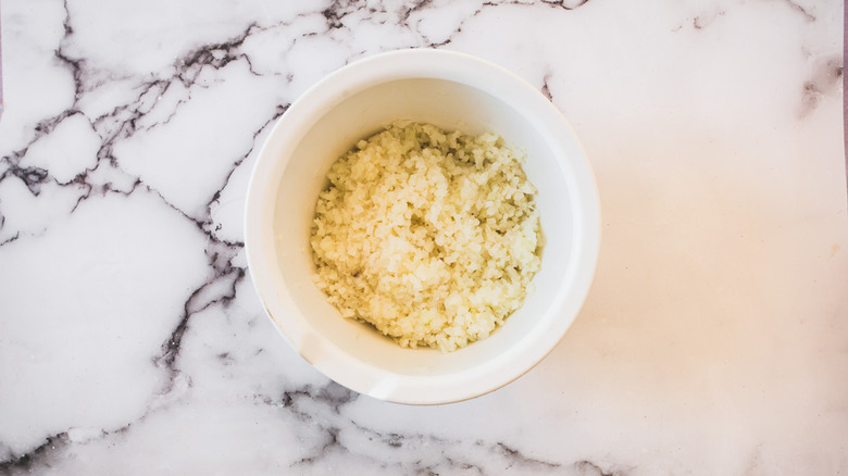 - In a microwave-safe bowl, combine cauliflower and water. Cover with a lid. Microwave for 3 minutes, and then leave covered for another 2 minutes. Fluff with a fork and set aside.
