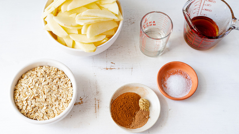 Once you have your apples, gather up the rest of your ingredients. You'll need coconut oil, maple syrup, cinnamon, sea salt, nutmeg, ginger, and oats.