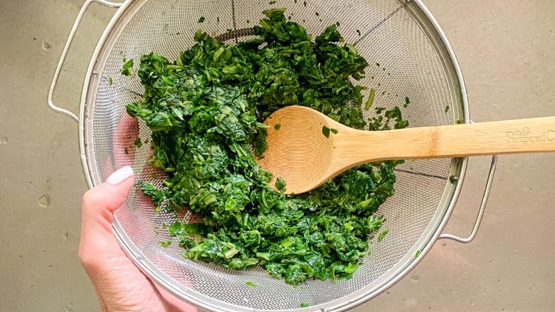 - Transfer the frozen spinach into a colander and run warm water over it, stirring to break down the spinach clumps. Using a wooden spoon, press the spinach against the mesh to drain as much water as possible.