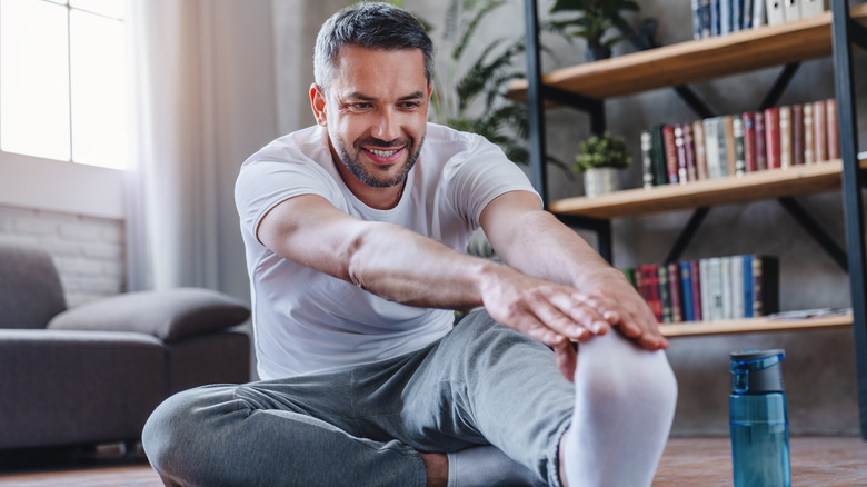 With the double knee grab, you can gently stretch your lower back. It has the added bonus of pressing the bottom of your back into the floor, which you can use to gently massage yourself. While in the stretch, rock side to side or spin your knees in a circle to move your lower back over the floor and gently press into your muscles. This mini-massage might help relax your lower back and alleviate some pain (via Prevention). Harvard Health Publishing recommends the double knee grab as a progression from the single knee grab.