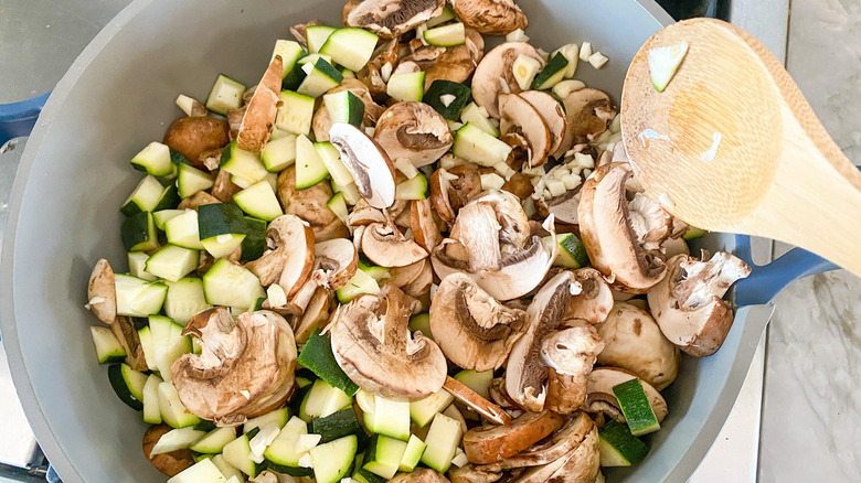 - Heat the oil in a pan over medium heat. Add the garlic, mushrooms, and zucchini to the pan. Sauté the garlic and mushrooms for 15 minutes, then add the spinach. Reduce the heat to low, stir to mix spinach with the mushrooms and garlic, and cover and cook for 5 minutes.