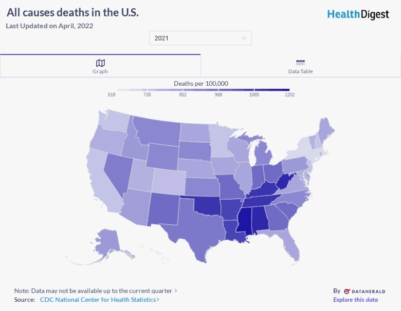 The state with the highest number of deaths per 100,000 in 2021 was West Virginia, followed by Mississippi and Kentucky. West Virginia had 1,232.1 deaths per 100,000, Mississippi had 1,204.5, and Kentucky had 1,139.7. In contrast, states with the lowest death counts were Hawaii, New York, and Connecticut. Hawaii had 630.8 deaths per 100,000, New York had 715, and Connecticut had 720.