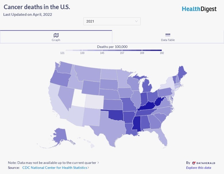 Kentucky and West Virginia are also the states with the highest rates of cigarette smoking, according to the CDC, which means there's likely a strong correlation that exists between the smoking rate and the cancer death rate.