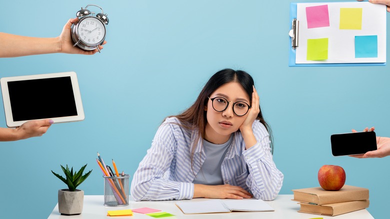 In an exclusive interview with Health Digest, health psychologist and sleep and stress/anxiety specialist Julia Kogan, Psy.D. explains that work-related stress can be a significant roadblock when it comes to getting things done. "When we are feeling stressed or anxious, we are more likely to procrastinate tasks or avoid them completely," she says. "This may be due to thoughts that it is too difficult, too complicated, or too challenging to start for some other reason." This vicious avoidance/anxiety cycle keeps us stressed, knowing we have to finish important tasks. In the end, it can affect the quality of our work, as we're rushing at the last minute.