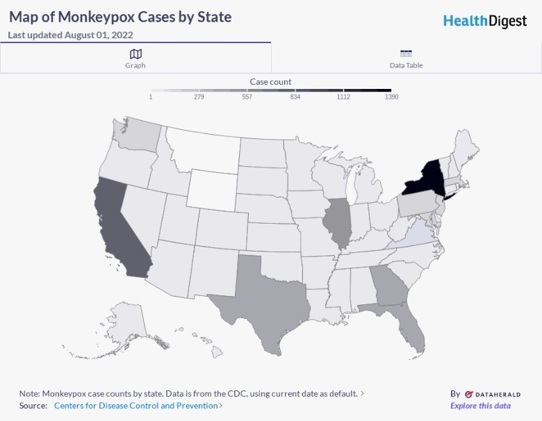 As far as the rest of the country stands, California is second highest on the list, with 827 reported cases of monkeypox. Illinois comes in third with 520 cases, while Florida has the fourth largest number with 442 cases. Georgia rounds out the top five with 430 cases. Texas is in the sixth spot, with 397 cases. The numbers drop significantly from there, with Pennsylvania reporting 161 cases of monkeypox; New Jersey, Massachusetts, and Maryland round out the top 10 with 155, 134, and 129 cases respectively. Beyond that, Washington reports 123 cases and Virginia has 105. The remainder of the states have less than 100 reported cases, with most below 50.