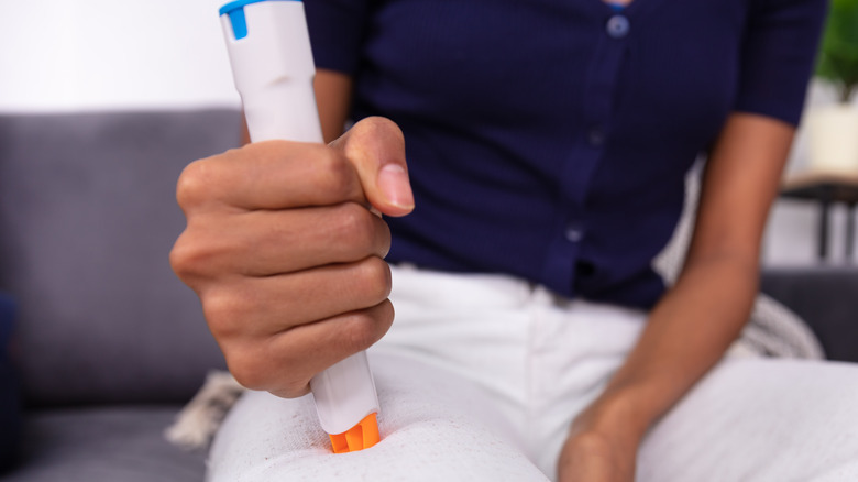 For more severe reactions, an immediate response is critical. If the reaction involves throat swelling or a hard time breathing, allergist and immunologist Anuja Kapil advises calling 911 immediately, as opposed to driving to an emergency department yourself. The ambulance technicians who arrive will be aware of what's going on and be able to treat you instantly. If your reaction is particularly severe, use an epinephrine pen to reduce symptoms, while you wait for the ambulance to arrive. Above all, try as much as you can not to panic — being aware of what's happening to you, and the logical way in which you can treat it, will help you hugely, says Kapil.