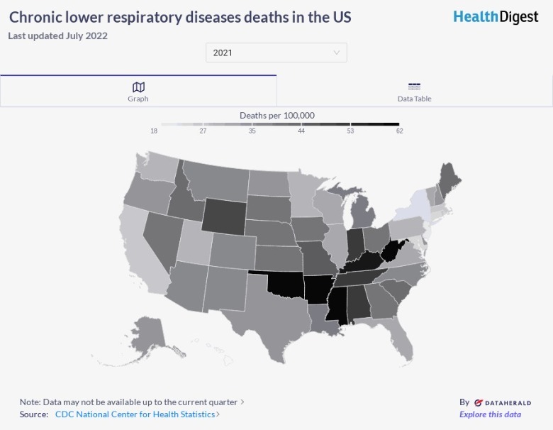 In fact, 5% of Americans have been diagnosed with either chronic bronchitis, emphysema, or COPD (per CDC). While that number may seem small, in 2020, some 873,000 people visited an emergency department due to COPD. Turns out, chronic lower respiratory diseases are the sixth leading cause of death in the United States — killing 152,657 in 2020 (via CDC). Chronic lower respiratory diseases affect many people nationwide, but the state with the most deaths related to these diseases may surprise you.