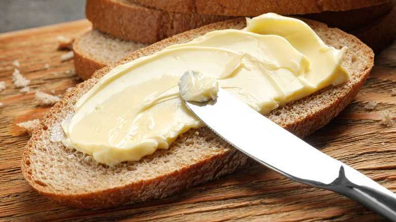 Margarine is especially rich in trans fats, which are pretty much the unhealthiest fats out there, and can skyrocket your bad cholesterol levels and increase the risk of heart disease (per the Mayo Clinic). One other impact of trans fats is that they can increase inflammation in the body, including in the skin, and therefore can make your eczema symptoms more severe (via Everyday Health).